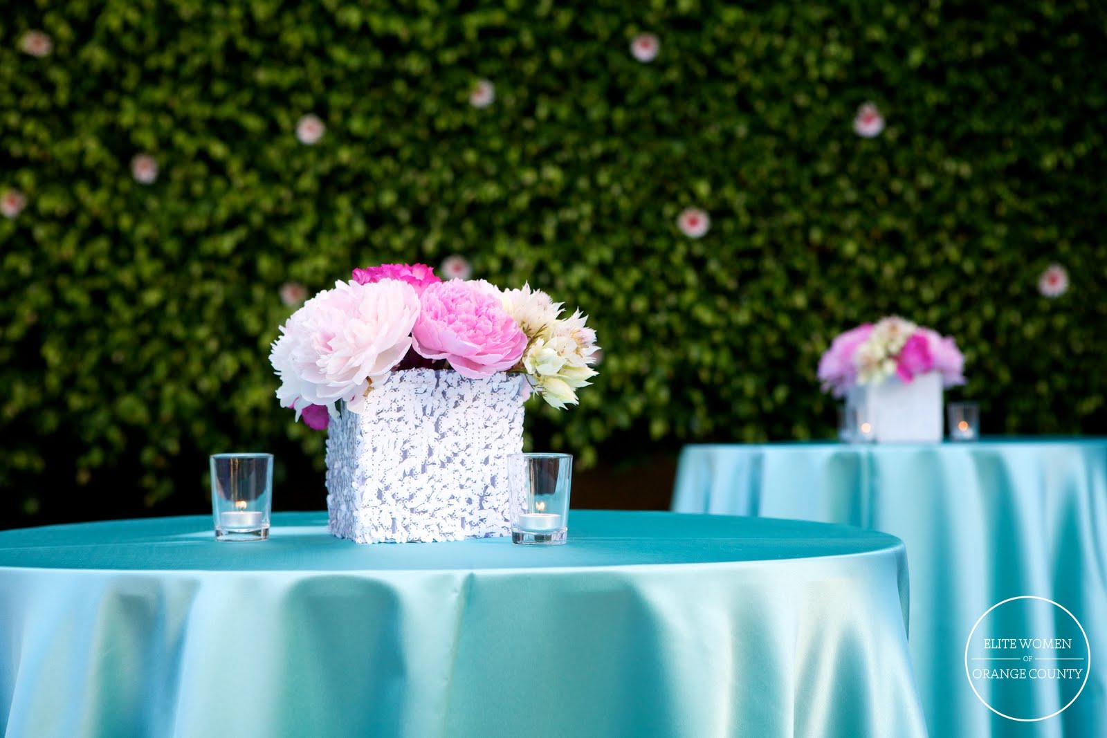 Pink Peonies, Gerber Daisies and chic white lanterns draped a Tiffany-blue backdrop of linens and décor on the Hyatt’s terrace for the Elite Women of Orange County’s first Seasonal Soiree on Thursday July 14, 2011 .