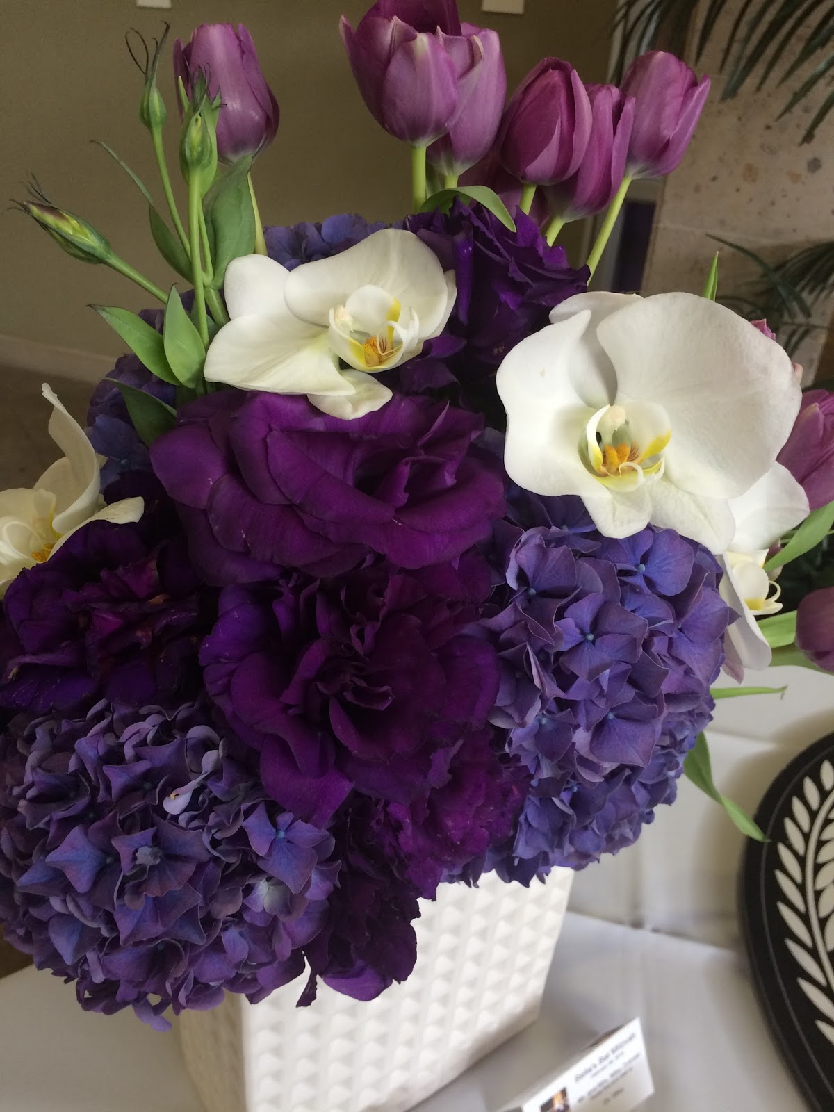 In floral décor, there are so many ways to incorporate a little, or a lot of purple.  We like to combine several different hues for a big impact.  How about a pop of no color – use white.  We love how white makes the other colors standout.   We also love the simplicity of one single stem.