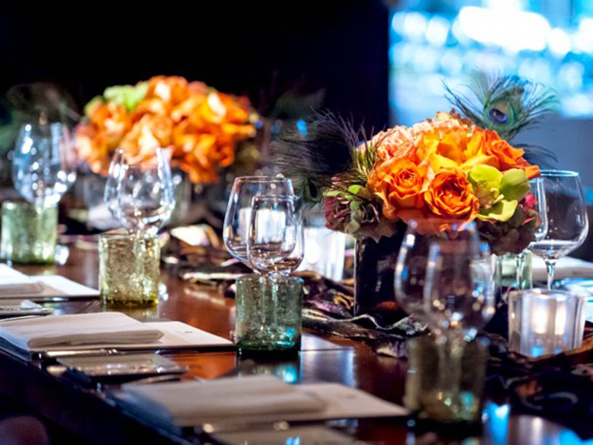 Keep your table looking chic with a bold, striking centerpiece. “Select autumn colors for a fall tabletop design while using modern touches to update your look,” says Lili Shadab of Elite Productions International. “Square copper containers, together with a bronze velvet runner and pops of orange on a wood table, brings this setting to life while keeping it modern. Peacock feather accents complete the look of the season.”