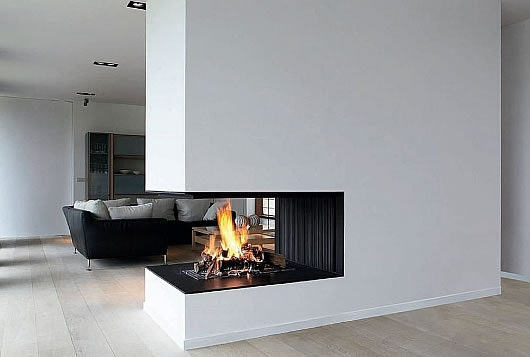 This fireplace acts as a room divider while giving the space an open feeling as well as a place a to enjoy.